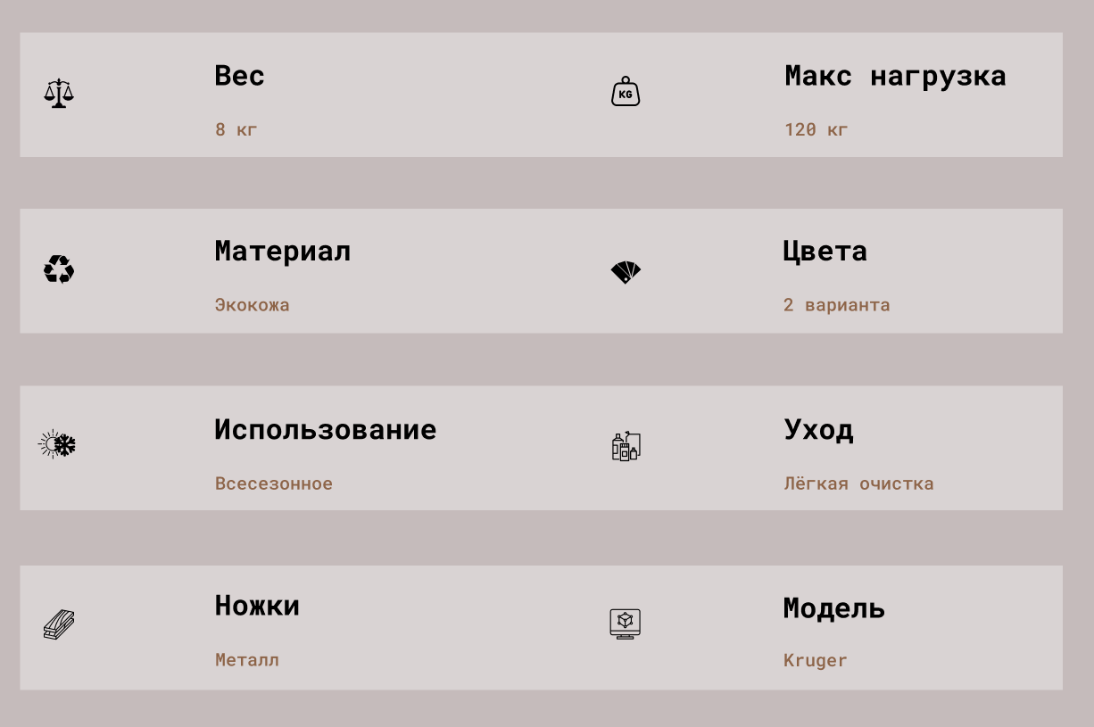 Комбинация прочных материалов — металл и экокожа — гарантирующая долговечность и удобство.