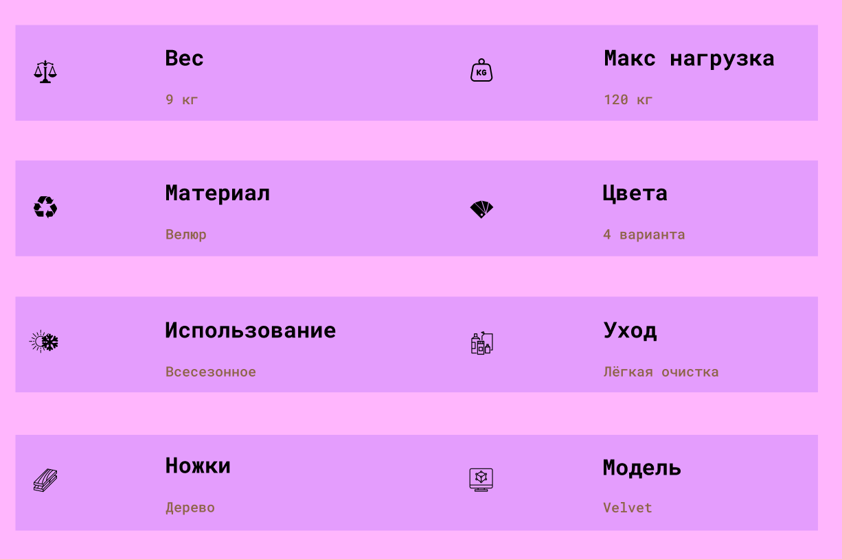 Разнообразие насыщенных цветов придаёт креслу индивидуальность и позволяет создавать разнообразные концепции оформления — от спокойных и воздушных пастелей до ярких и запоминающихся акцентов. Velvet отлично подходит для различных мероприятий — от деловых встреч и выставок до креативных фотосессий и камерных вечеринок.