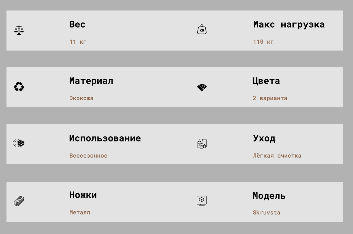 История кресла связана с философией IKEA — создавать доступную, удобную и функциональную мебель для повседневного использования. В аренде Скрувста продолжает эту традицию, предлагая организаторам мероприятий оптимальное сочетание цены, качества и удобства.