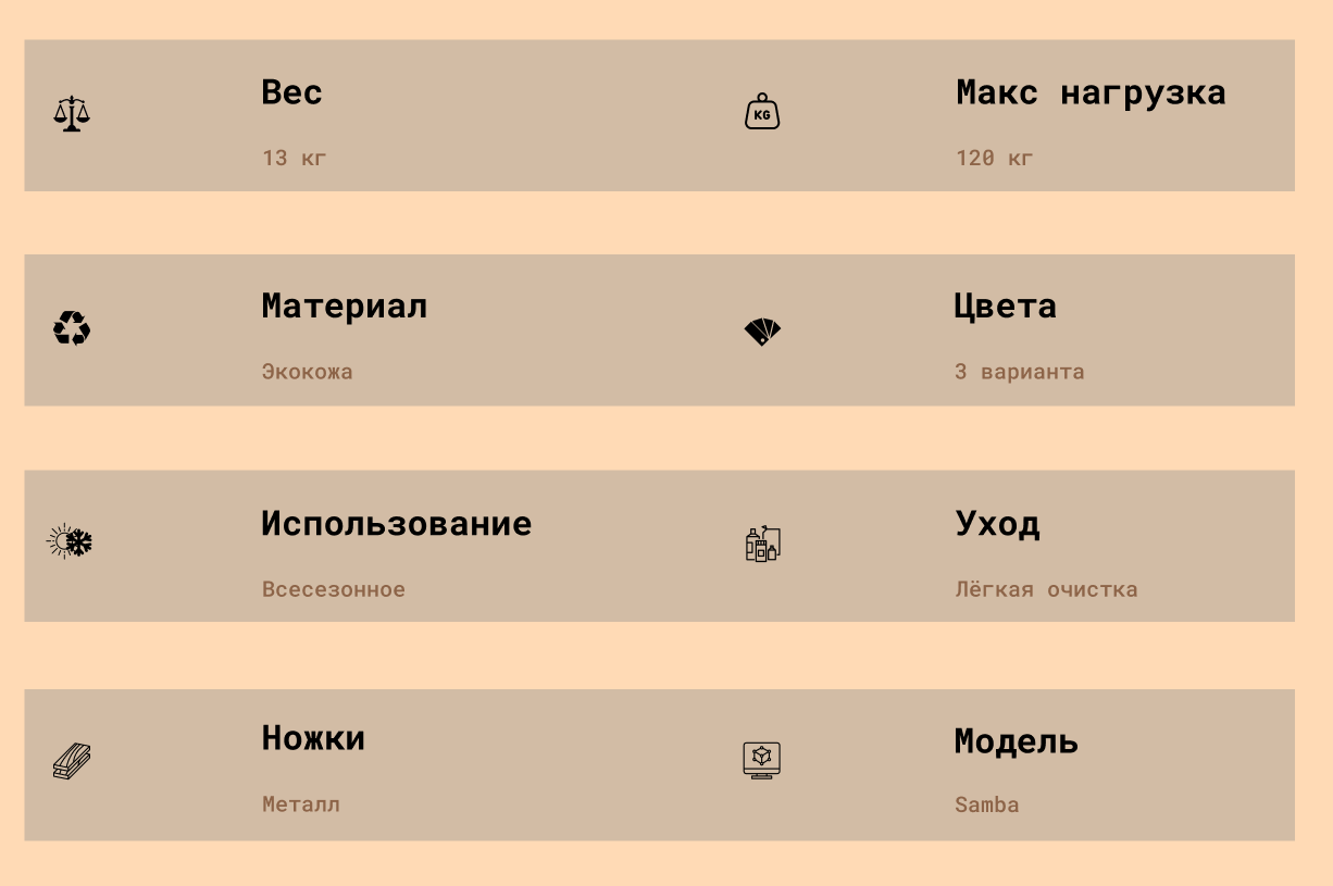 Модель предлагается в трёх классических цветах — чёрном, бежевом и белом, что позволяет идеально подстроить мебель под стиль мероприятия и корпоративные цвета.