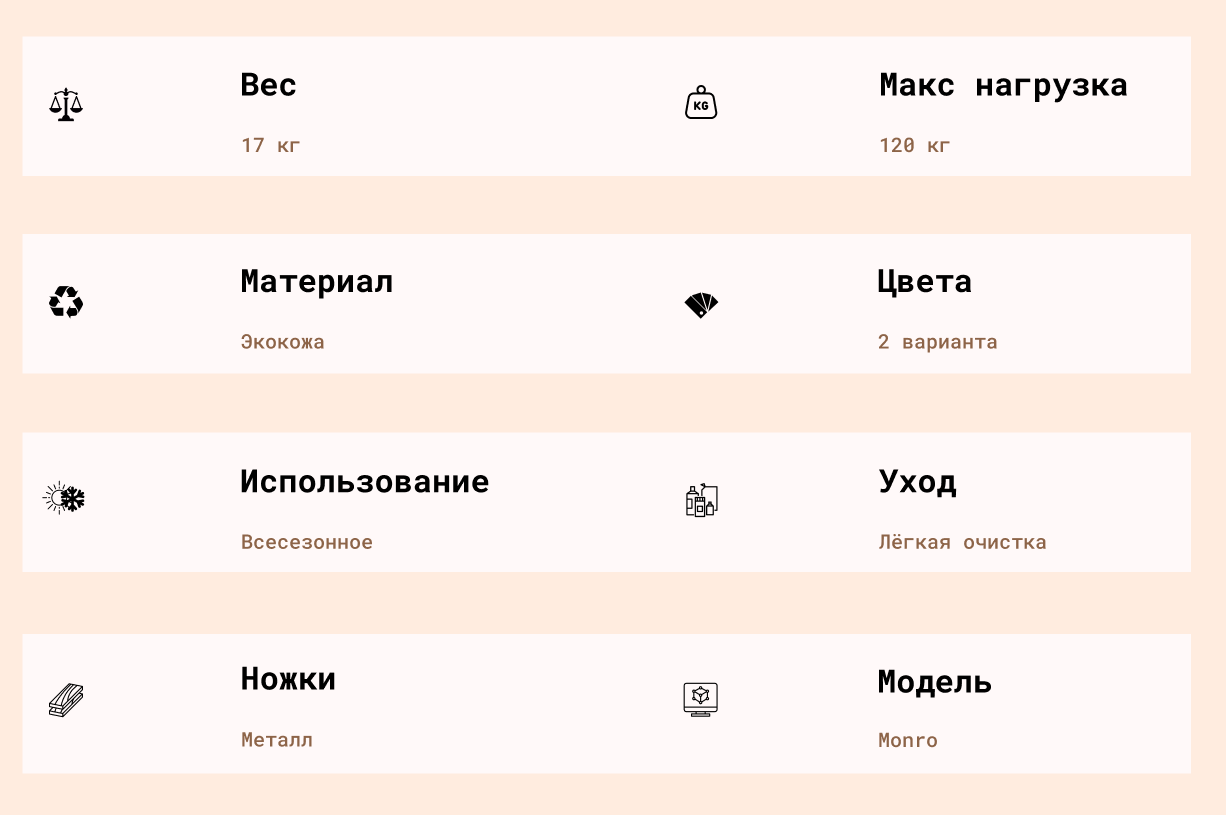 История кресла Monro начинается как ответ на растущие требования к офисной мебели, способной удовлетворить потребности различных сегментов рынка. Комбинация инновационных материалов с классическим дизайном позволяет креслу выглядеть современно и при этом сохранять практичность и долговечность. Экокожа, используемая в обивке, обладает уникальными свойствами — она воздухопроницаема, но при этом устойчива к влаге и быстрыми загрязнениями, что обеспечивает простоту в уходе.