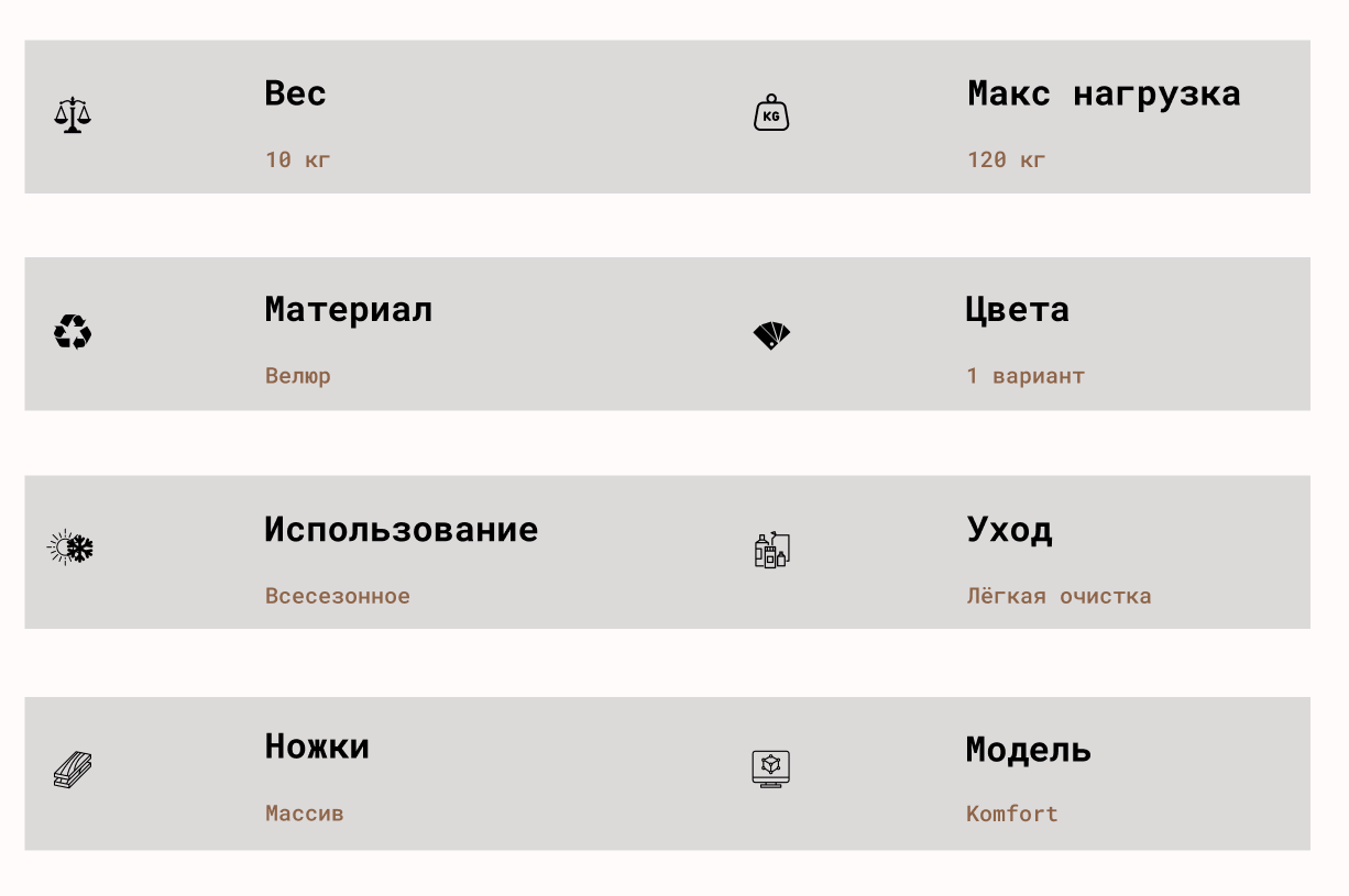 История кресла Комфорт связана с развитием аренды мебели для временных пространств. Организаторам нужны были модели, которые одновременно выглядят аккуратно, удобны для посетителей и просты в эксплуатации. Комфорт стал таким решением — универсальным элементом для зон ожидания, переговорных и лаунж-зон. Его лаконичный дизайн и мягкая велюровая обивка делают кресло подходящим для деловых встреч, выставочных стендов, фотозон и творческих площадок, где важны аккуратный внешний вид и удобство гостей.