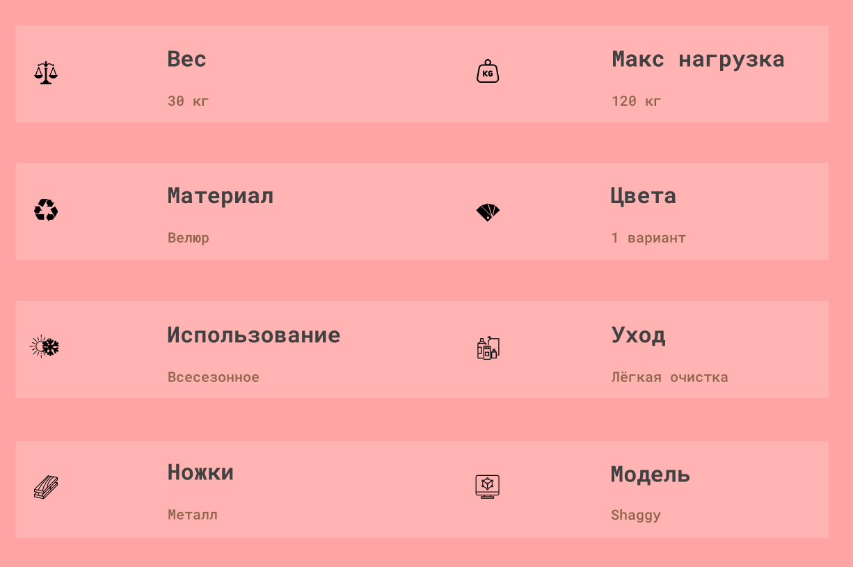Дизайн кресла Shaggy Pink вдохновлён классическими формами стульев с высокой спинкой и удобными подлокотниками, которые обеспечивают максимальный комфорт и эргономику. Розовая бархатистая обивка придаёт модели мягкость, эксклюзивность и визуальную привлекательность, делая её заметной деталью любой зоны отдыха, фотозоны или lounge-пространства. Наполнитель кресла обеспечивает удобное и расслабляющее сидение даже при длительном пребывании гостей.