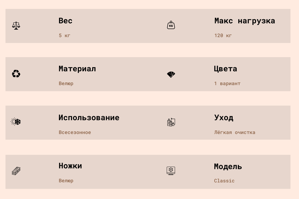 Пуфик Classic изготовлен из прочного деревянного каркаса и качественной бархатистой ткани, устойчивой к износу. Наполнитель обеспечивает удобное и мягкое сидение, а компактные размеры позволяют использовать пуфик в любых зонах: как дополнительное место для гостей, элемент фотозоны, уголок для отдыха или переговорную зону.