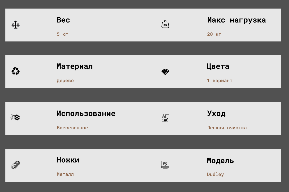 Столик Dudley отличается устойчивой конструкцией и приятной на ощупь поверхностью. Он выглядит аккуратно и профессионально, создаёт ощущение порядка и помогает организовать пространство так, чтобы гостям было комфортно находиться на площадке длительное время. Это особенно важно для мероприятий, где ценится атмосфера и внимание к деталям.