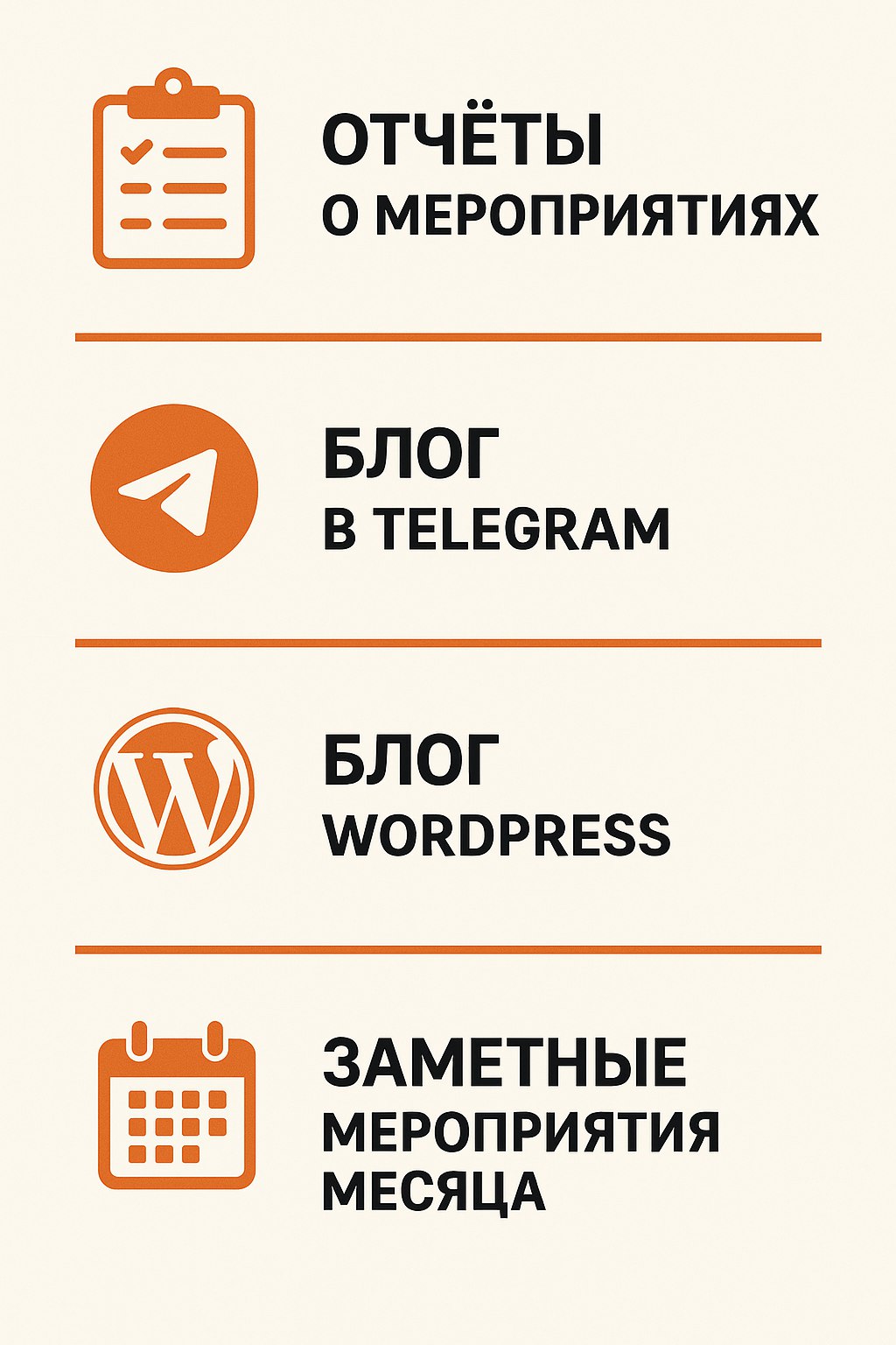 - Являюсь сооавтором отчетов о мероприятиях, где мы работали. Выпустили 530 отчетов с 2021 года = мероприятий осветили.